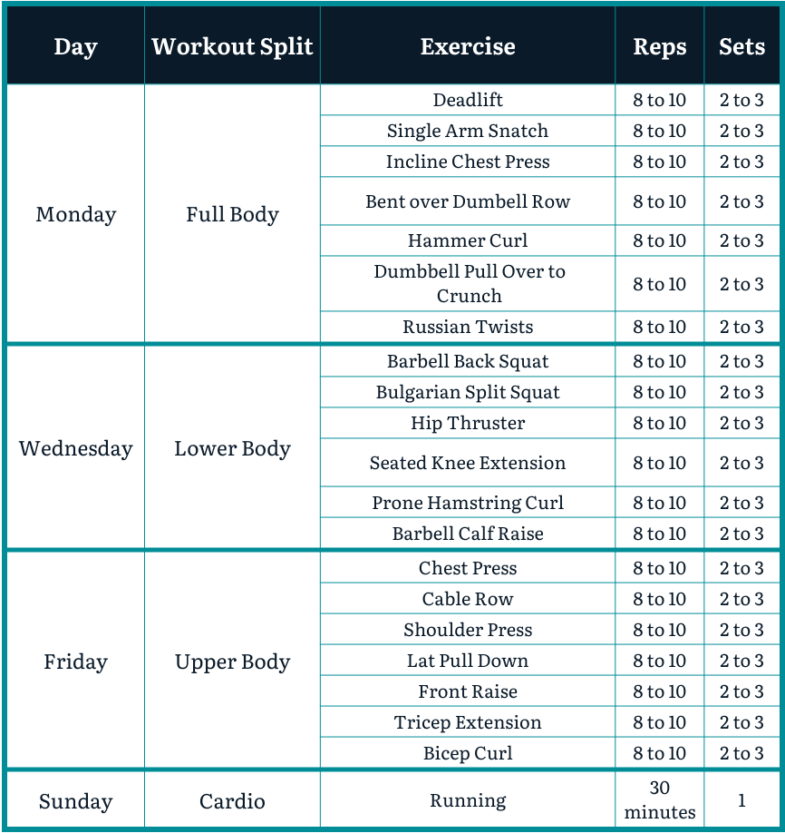 The first week is all about building a solid foundation. It’s crucial to focus on proper form, establish good habits, and prevent injury from poor technique. In this week, you’ll be learning exercises and focusing on lighter weights with higher repetitions.